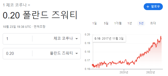 위의 차트만 본다 하더라도 코로나 시작 이후로 약 20~25 정도 상승한 것을 확인할 수 있습니다. 쇼핑을 할 때도 동일한 물건이 체코 코루나 대비 폴란드 즐워티로 구매하면 더욱 저렴한 것이 눈으로도 많이 보이기 때문에 쇼핑을 할 때는 폴란드에서 하는 것이 개인적으로 매우 이득적인 부분이 많이 있습니다.